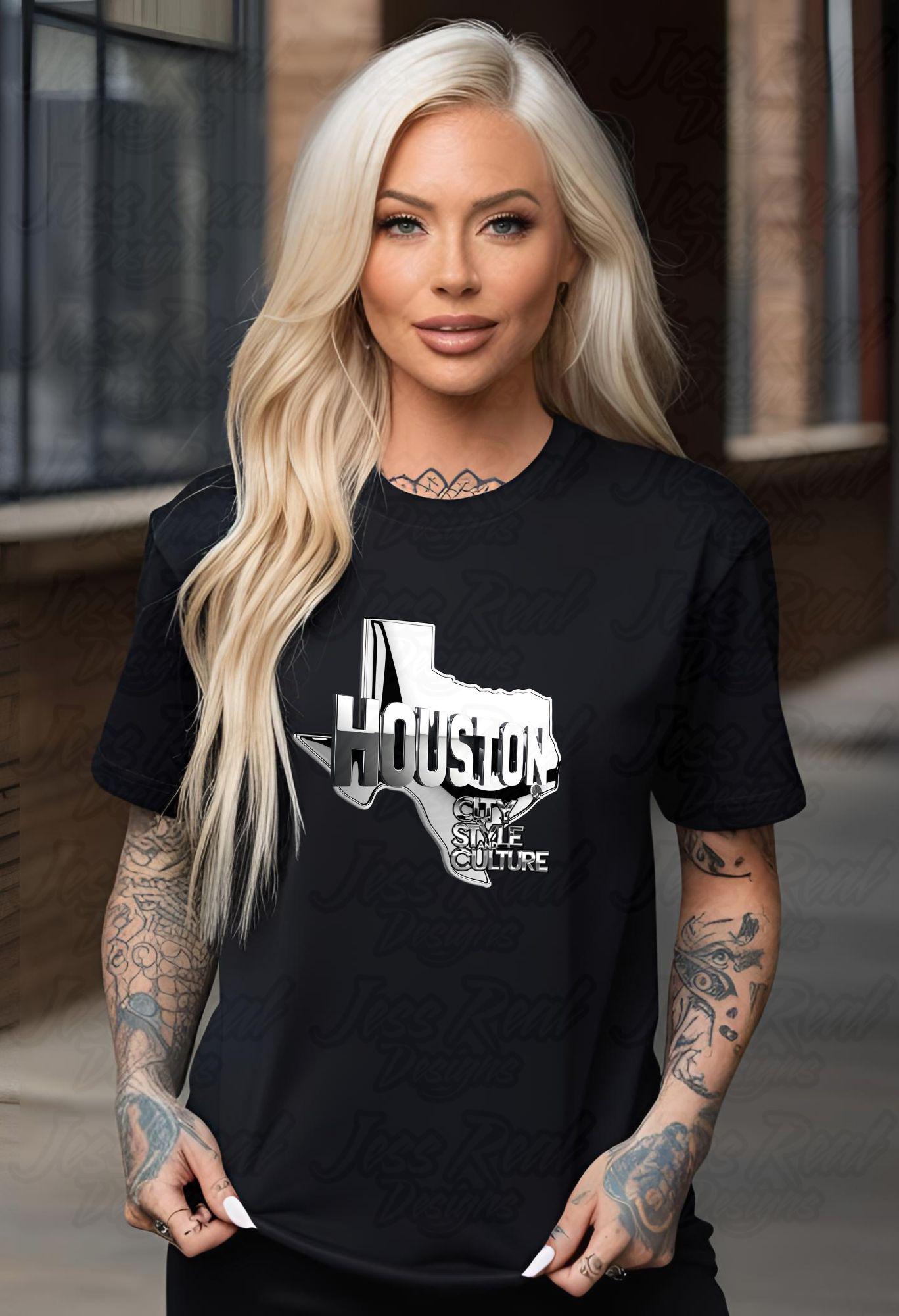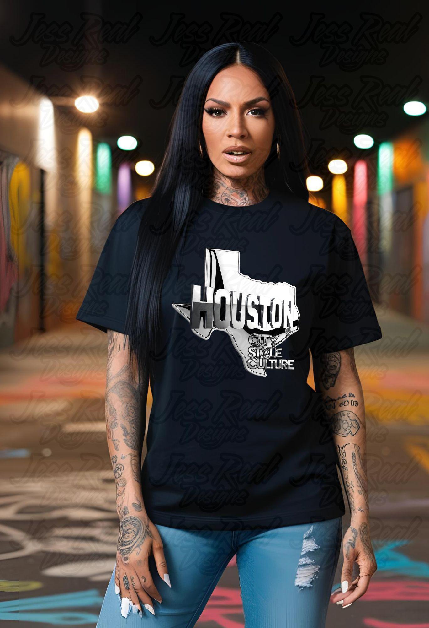 Represent your love for Houston Texas with our stylish black shirt featuring a chrome design that embodies the city's unique style and culture. Perfect for street wear enthusiasts, this shirt showcases your passion for chrome in a sleek and modern way. Bring some Texas flair to your wardrobe with our City of Style and Culture shirt.