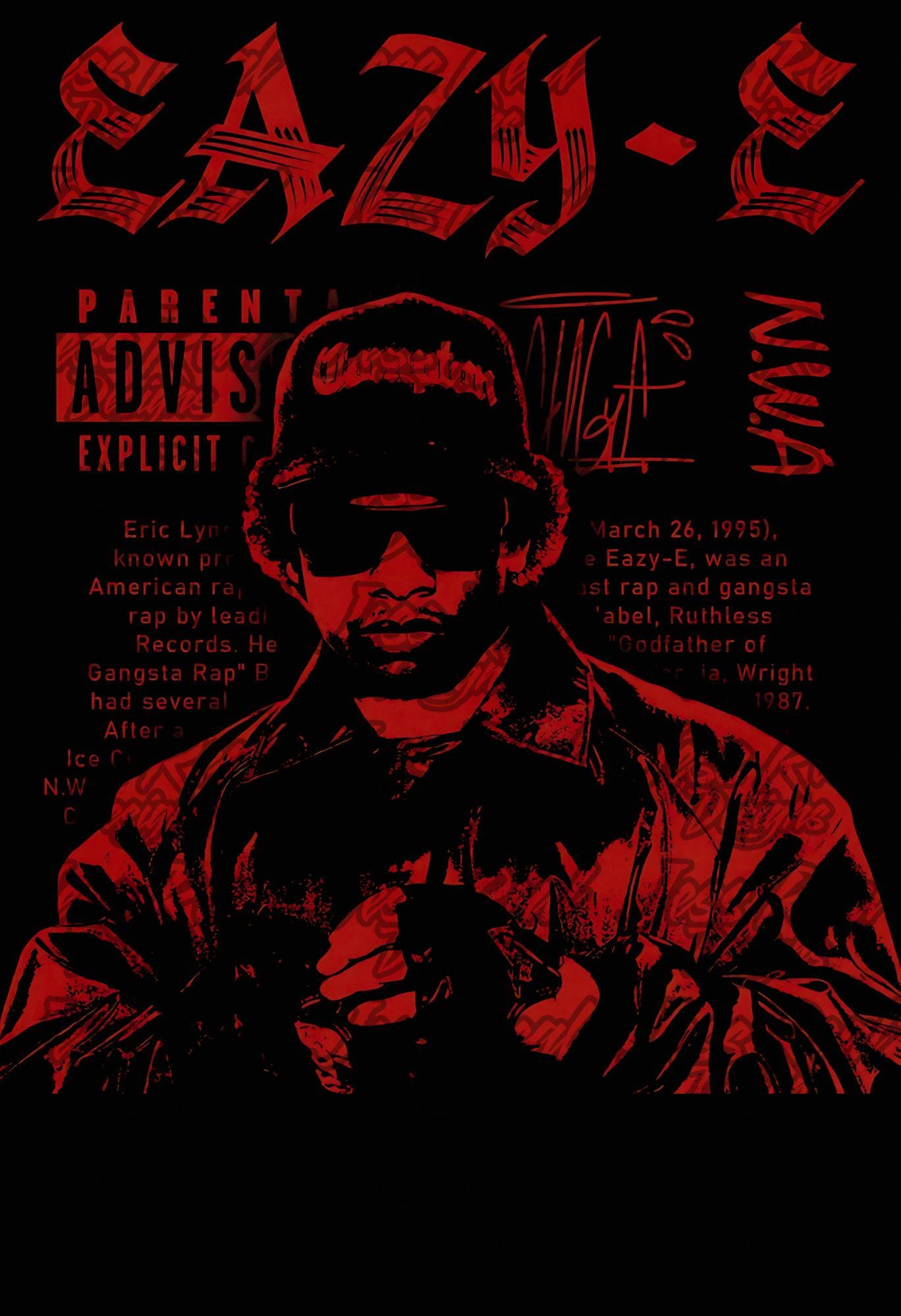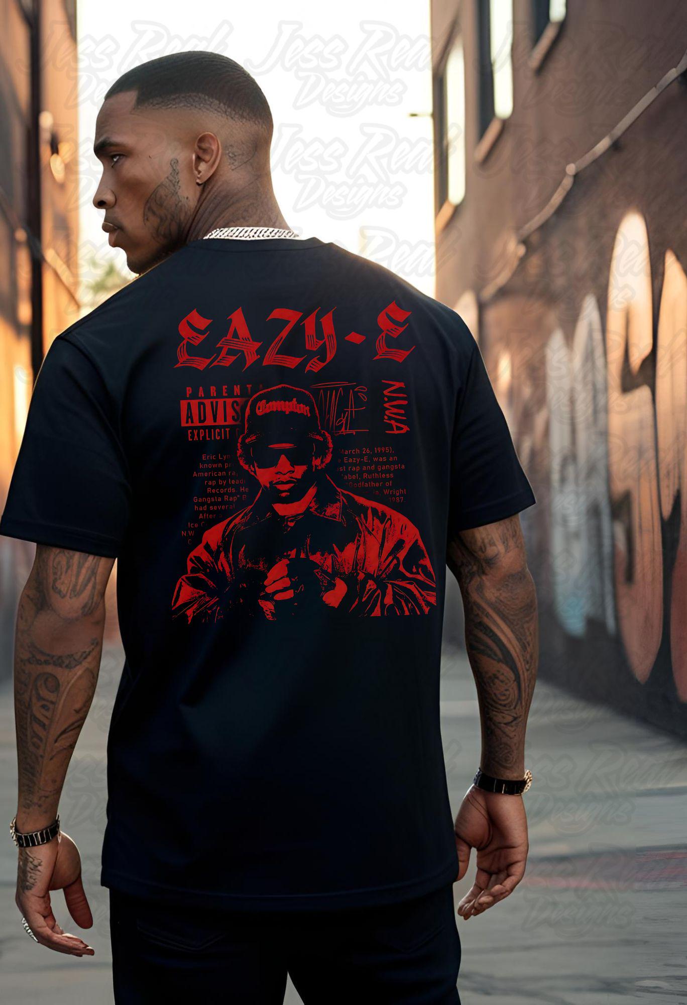 This all black shirt features a bold, red print of Easy E, a prominent rapper from the Generation X era. The striking design is sure to catch the eye of those who lived through this influential time period. Pay homage to this iconic musician with this standout shirt.